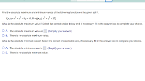 (1 point) find the absolute maximum and minimum of the function f (x, y) = x2 + y2 subject to the constraint x4 + y4 = 1. Finding minimum and maximum value of 3d function hot network questions how do i model the arms of a car axle as shown in the reference photos, as a single piece? Is a relative minimum also an absolute minimum? Transcribed image textfrom this question. What is the absolute maximum on a graph?